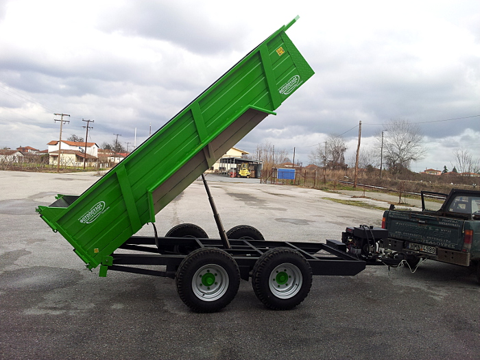 Ανατρεπόμενη πλατφόρμα μεταφοράς 8 ton με χαμηλό ύψος φόρτωσης κατάλληλη για όλα τα είδη φορτίων, μεταφορών κτλ. Ρυμούλκα ανατρεπόμενη με δυο άξονες για τρακτέρ, όπως και για αγροτικό όχημα 4Χ4 αφού έχει προσαρμοσμένο βενζινοκινητήρα με αντλία πιέσεως λαδιού και χειριστήριο, για να λειτουργήσει αυτόνομα το σύστημα ανατροπής όταν έλκετε από τζιπ, φορτηγάκι κτλ. Καινοτόμο ανατρεπόμενο τρέιλερ, ιδανικό για σύγχρονο αγρότη που εκτός τα παραπάνω διαθέτη και σύστημα καθαρισμού της ελιάς από τα φύλα (κοσκίνα) κάνοντας πιο εύκολη την εργασία του επαγγελματία ελαιοπαραγωγού.